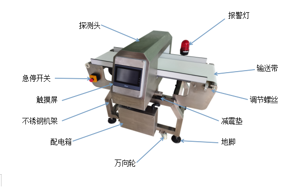 金屬探測儀是使用電磁場來檢查在傳送帶流水線上傳送的被檢查品,當(dāng)探測出設(shè)定值以上的金屬信號時,輸出金屬混入的警報或輸出由選擇器發(fā)出的剔除指令信號的裝置。