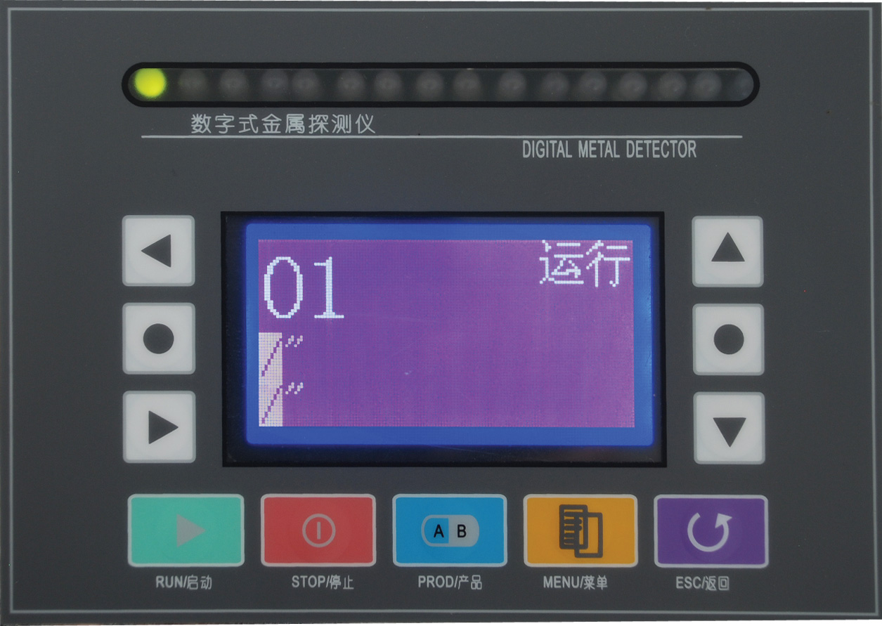 指示燈 從左起,第一個燈為運行指示燈。正常探測時,該燈為綠色。第二個燈為NG指示燈,當探測到金屬異物時,該燈為紅色。其余燈為等級顯示LED,顯示金屬成份探測等級。